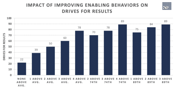 Improvement of these enabling behaviors will have a dramatic impact on your ability to improve driving for results. The following graph shows results from over 100,000 leaders. If a leader is below average on all four enabling behaviors, their average effectiveness rating on drives for results is at the 22nd percentile. Improving all four behaviors to above-average performance lifts the effectiveness of drive for results to the 78th percentile. Finally, having just three at the 90th percentile gets you to the 89th percentile.